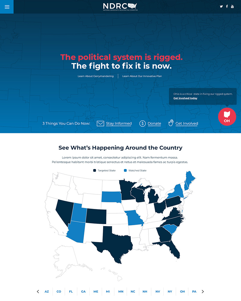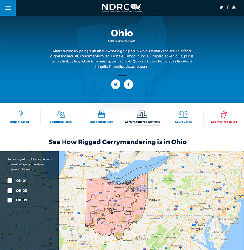 The NDRC is Attorney General Holder's organization dedicated to addressing gerrymandering. I worked with his team to build them a site that could explain the gerrymandering and redistricting process to the general public since it only happens once a decade (typically). Additionally, we created content and design strategies to help them tell the story of how the process works differently state by state. By utilizing IP recognition we immediately served the users content about their state and urgent calls to action specific to that state. We also designed an in-depth state resource page that dynamically updated calls to vote in a primary vs. general election, prompts to register to vote by state deadlines, and encouraged local offline organizing. The content strategy also called for candidate profile information of offices that controlled redistricting, state legislature diagrams that built themselves with javascript to address frequent turnover, and Census map shapefiles to allow a user to visually see the most egregiously drawn Congressional districts laid over Google Maps to see where they fit in.
