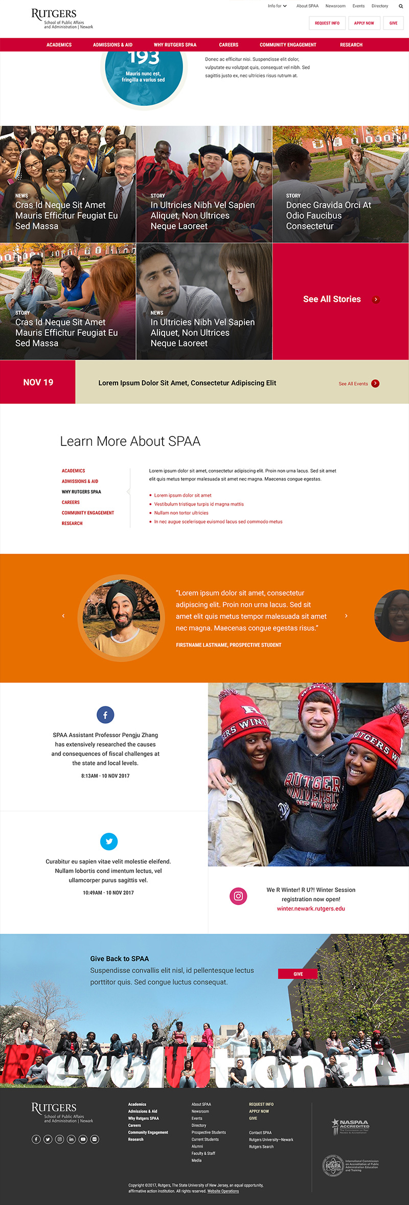 I worked on a design subcontract for the School of Public Affairs and Administration (SPAA) to study their web usage and create a redesign. The school has a large international community and strong reputation but had a tremendously outdated and unresponsive site that was not meeting user needs. We conducted discovery exercises with the SPAA Dean and staff as well as a comparative landscape analysis. I produced both the visual design and development documentation utilizing atomic design methodology.